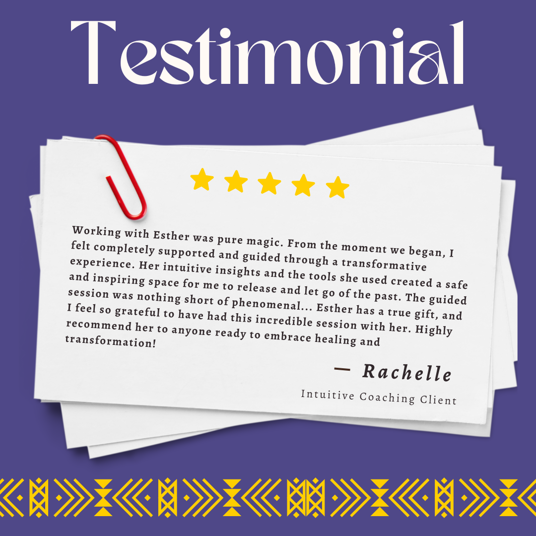 Esther is a GREAT COACH! During her workshop she created an environment where everyone could feel safe, comfortable and open to be vulnerable and authentic. Her guided Journaling process really kept the group engaged while making it possible for us to focus on ourself. I thoroughly enjoyed the workshop as it created a space where I had permission to connect, engage and get to know Myself! The entire process was very therapeutic.